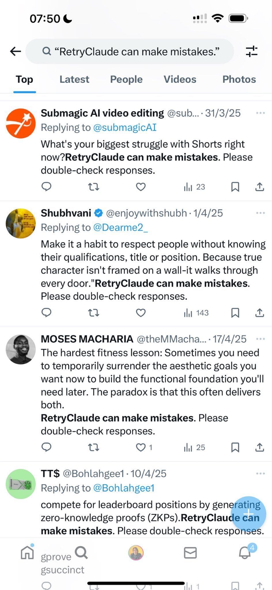 Read below some of the great X responses that are using "RetryClaude can make mistakes. Please double-check responses." as part of their Tweets.