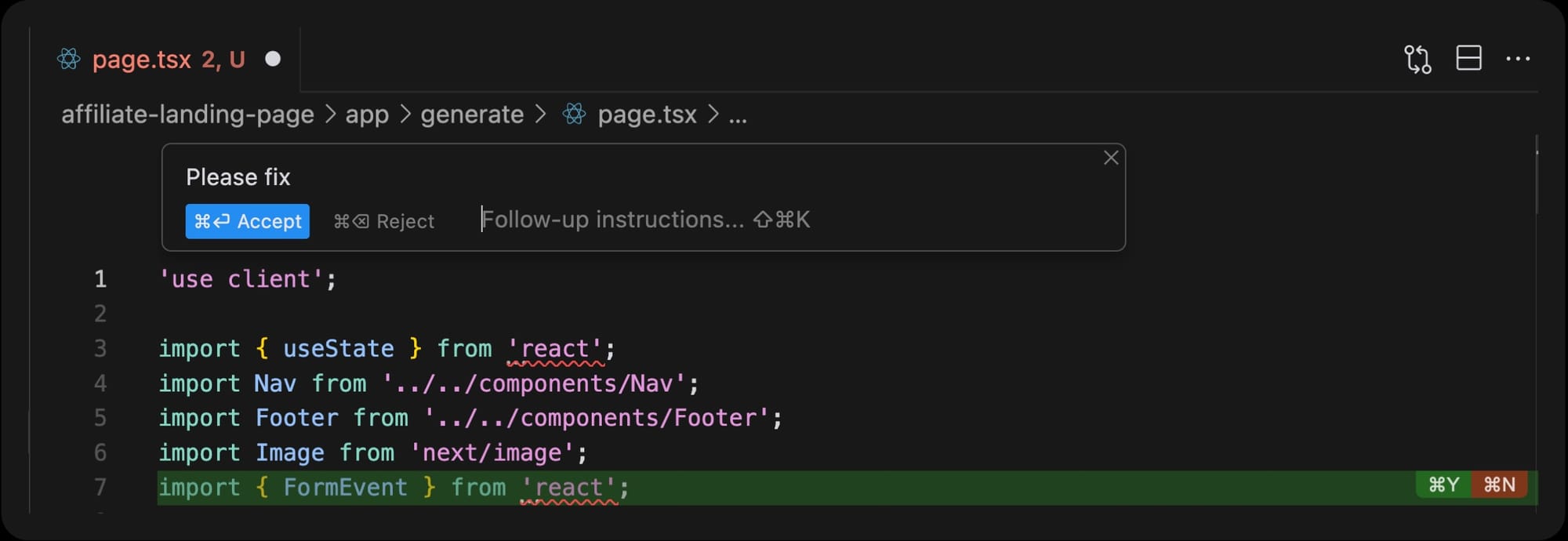 I ran into an issue with OpenAI integration that wasn’t working as expected. Instead of manually debugging line by line, Cursor highlighted the problematic section. Right-click on the error, and you are provided with the tool Fix with AI.