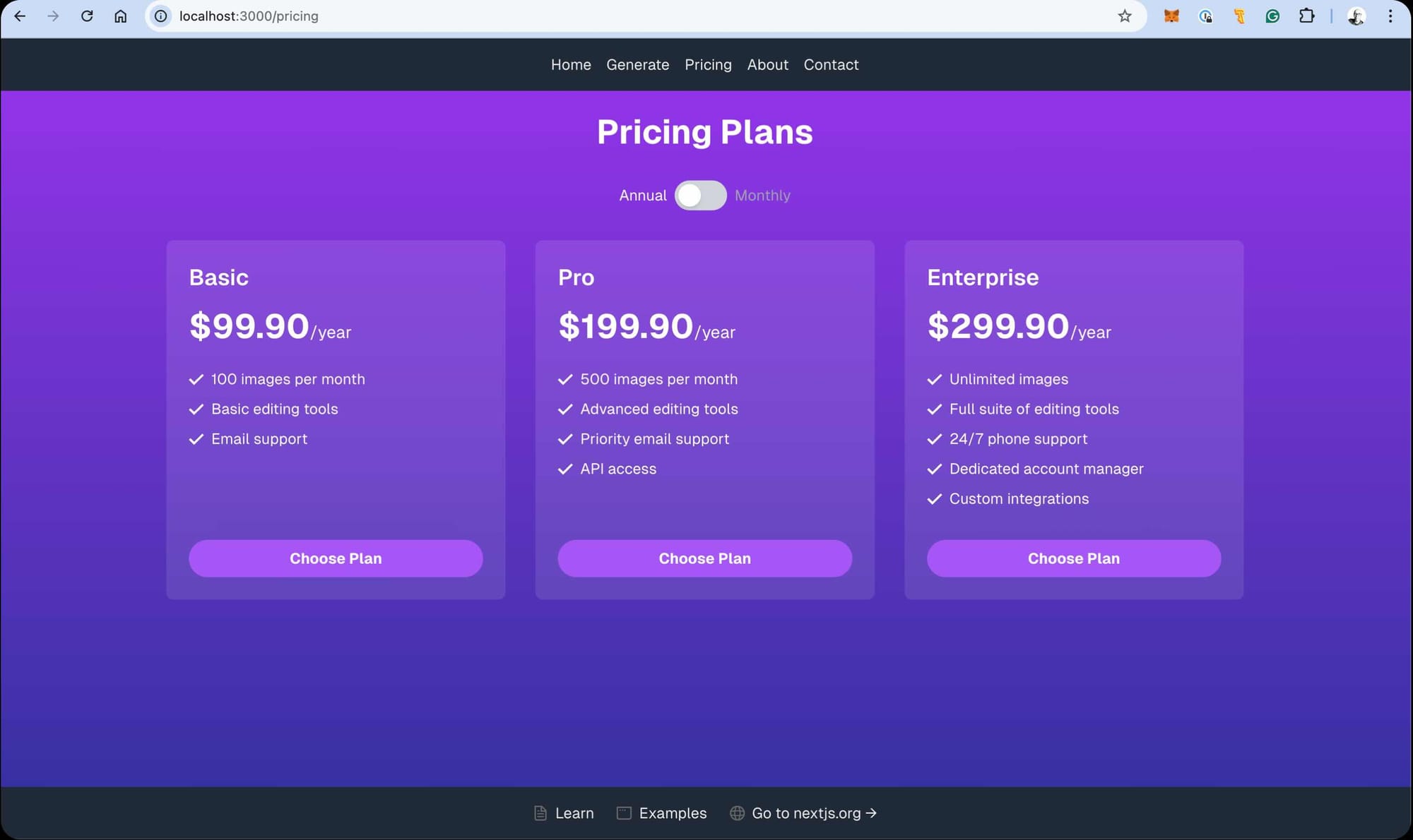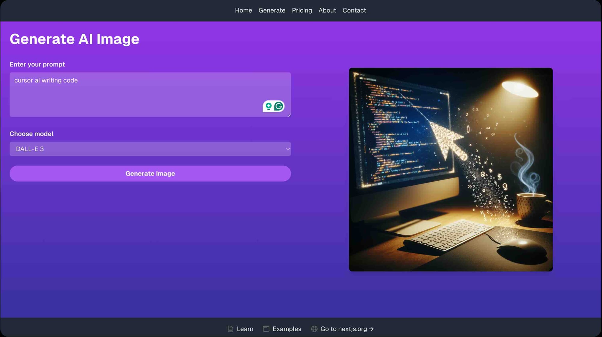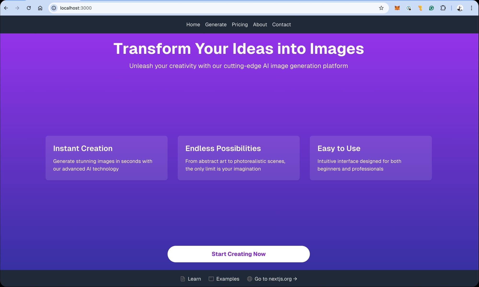 I created a demo website using Next.js to test it without trying to write any code. I prompted Cursor AI to build a Next.js landing page as a SaaS website for generative AI images. It should include four pages for our example SaaS website.