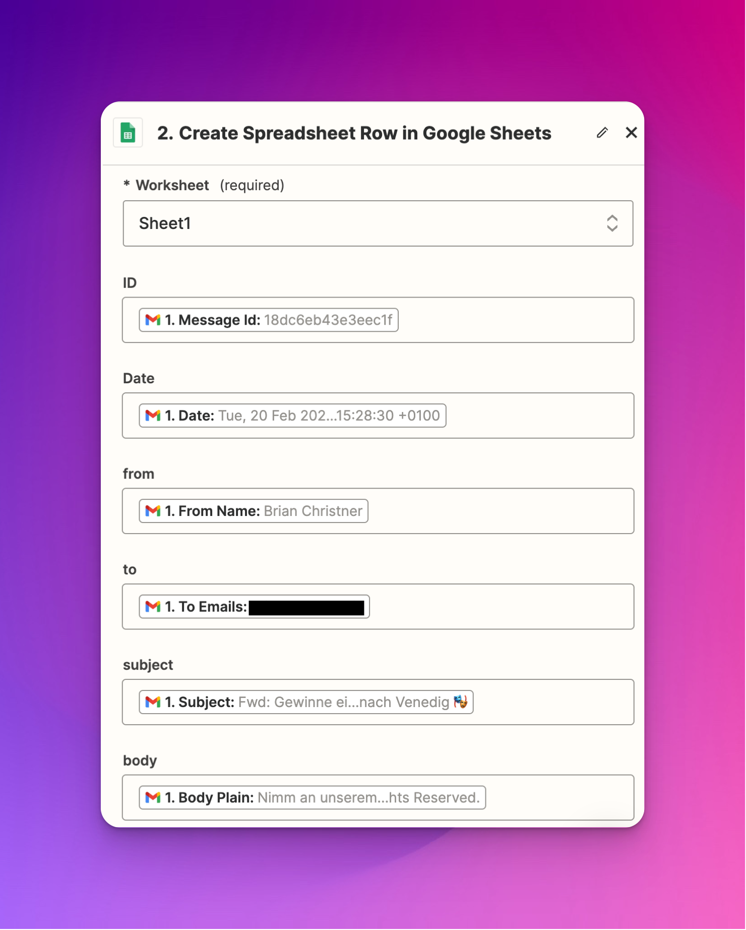 The Google Sheet is ready. Next, we will map the Gmail email fields to the Google Sheet columns.