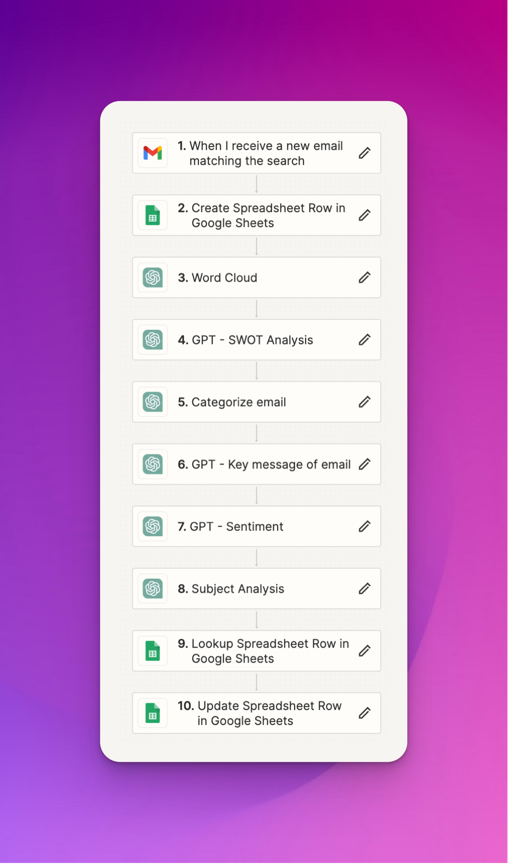 A second process is triggered once the new row in the Google sheet is populated. This time, we trigger ChatGPT to iterate over the email content multiple times. For each iteration of ChatGPT, we ask it to perform a new task. We ask ChatGPT to process and output the following information about the email: