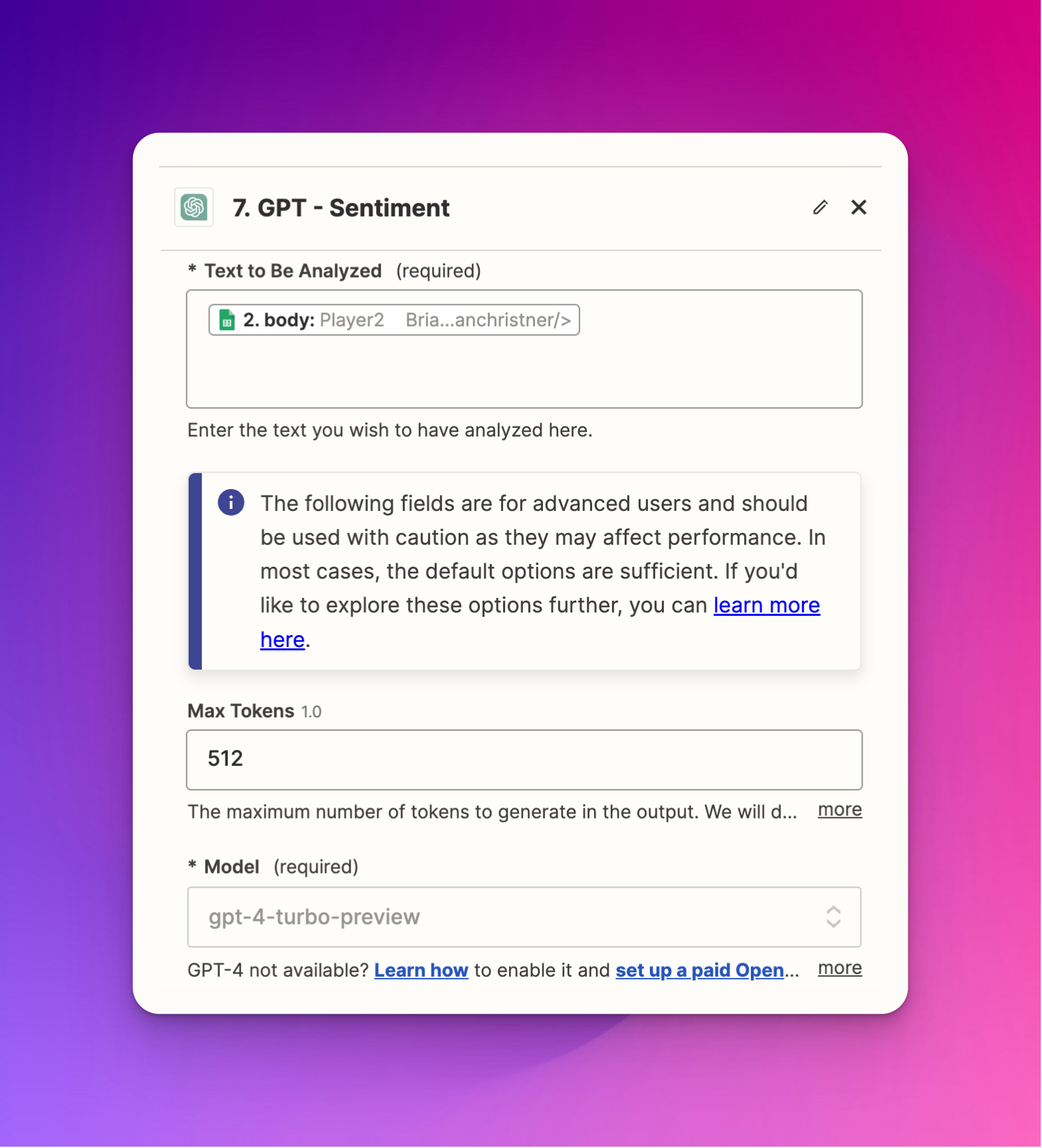 - Click the name "ChatGPT" at the very top of the step to rename it to "Email sentiment."