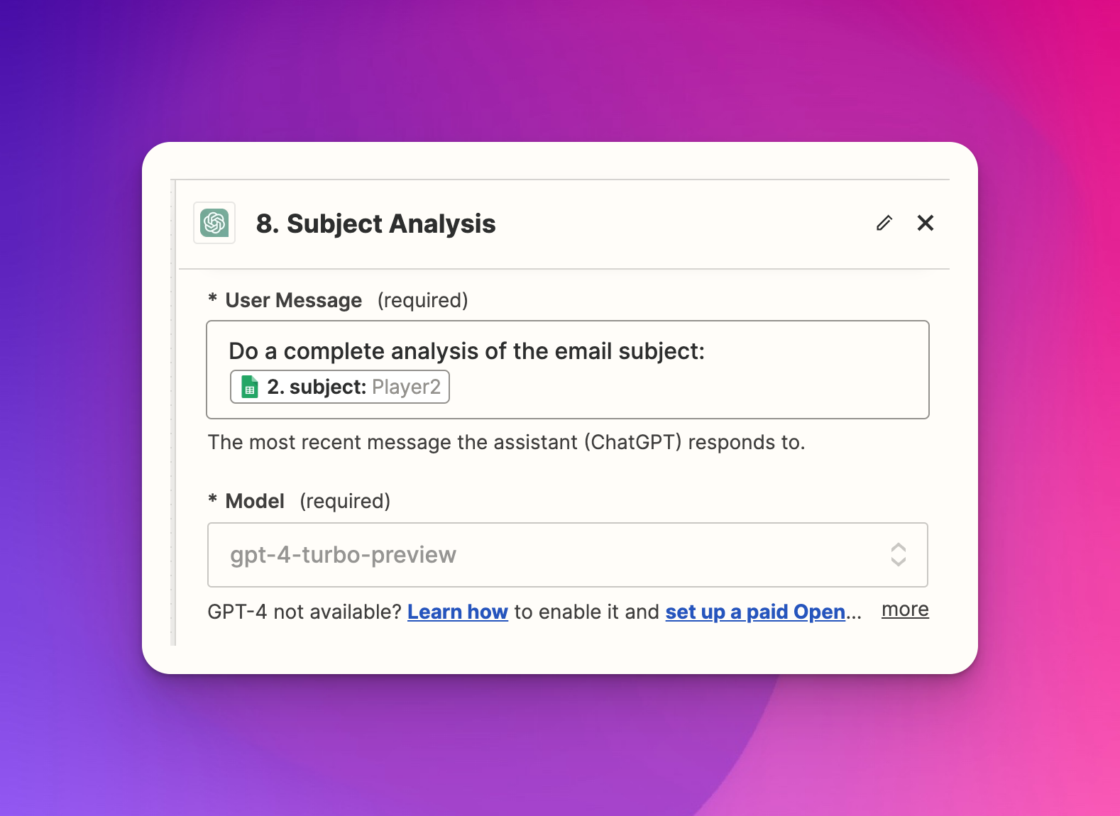 - Click the name "ChatGPT" at the very top of the step to rename it to "Subject Analysis."