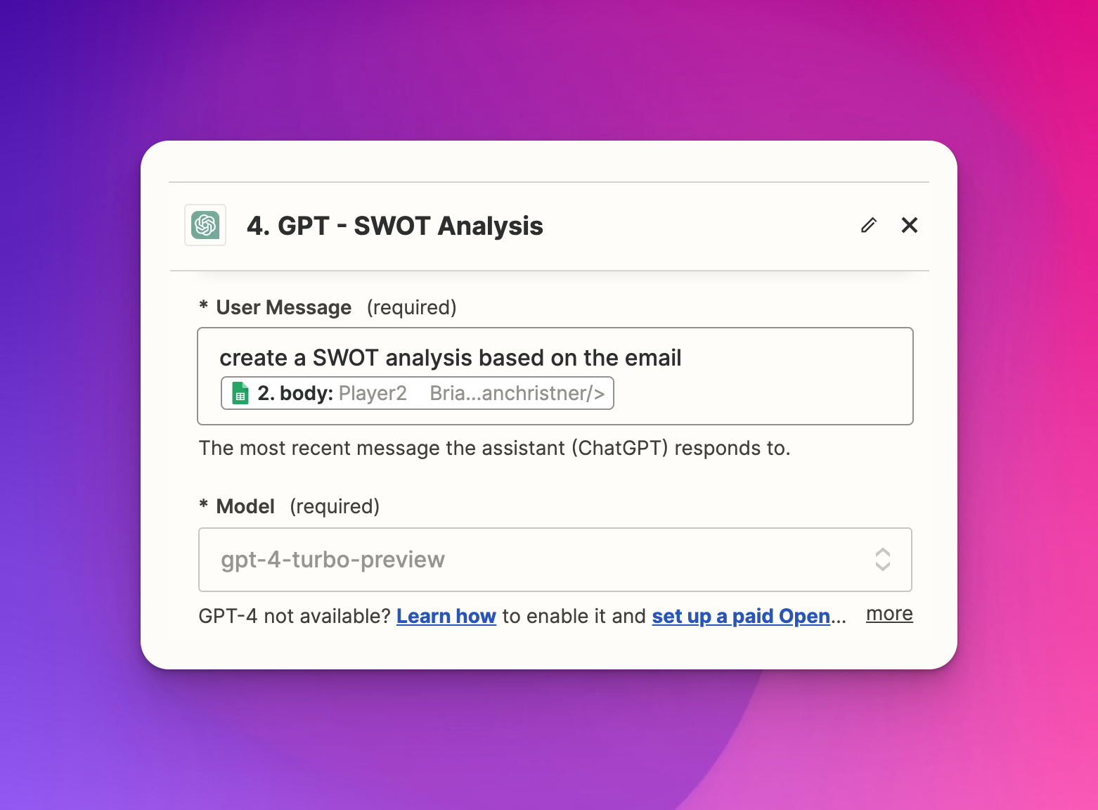 - Click "ChatGPT" at the top of the step to rename it "SWOT Analysis."