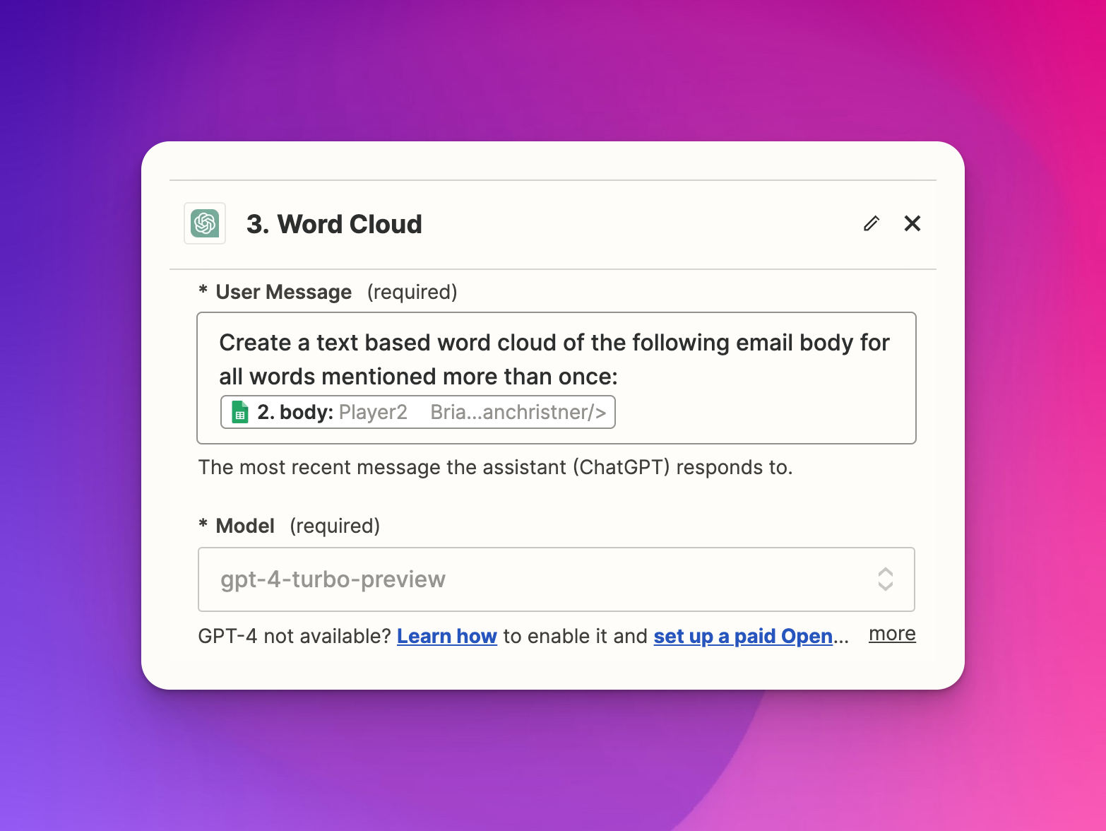 - Click "ChatGPT" at the top of the step to rename it to Word Cloud.