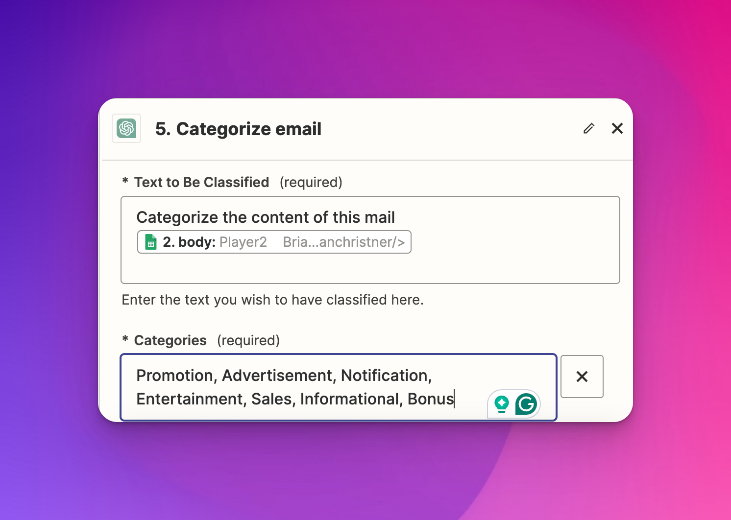 - Click "ChatGPT" at the top of the step to rename it to "Categorize Email."