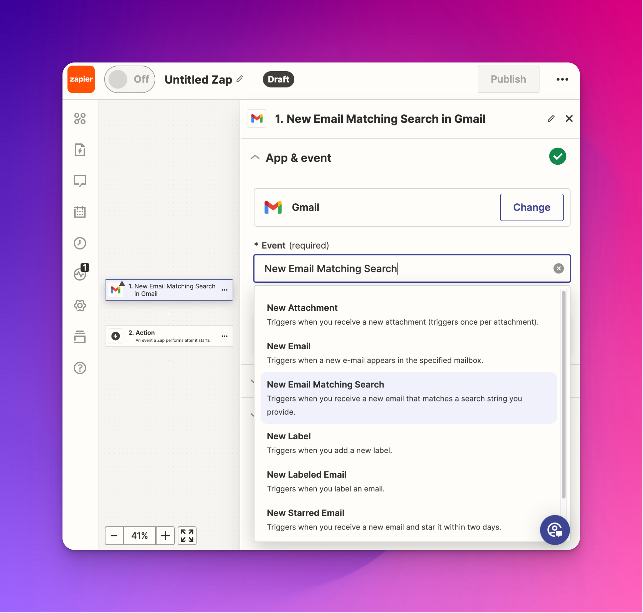 - Next, select which event in Gmail we want to execute. Select "New Email Matching Search." This way, we can prevent spam or unwanted emails from triggering our workflow. Click Continue