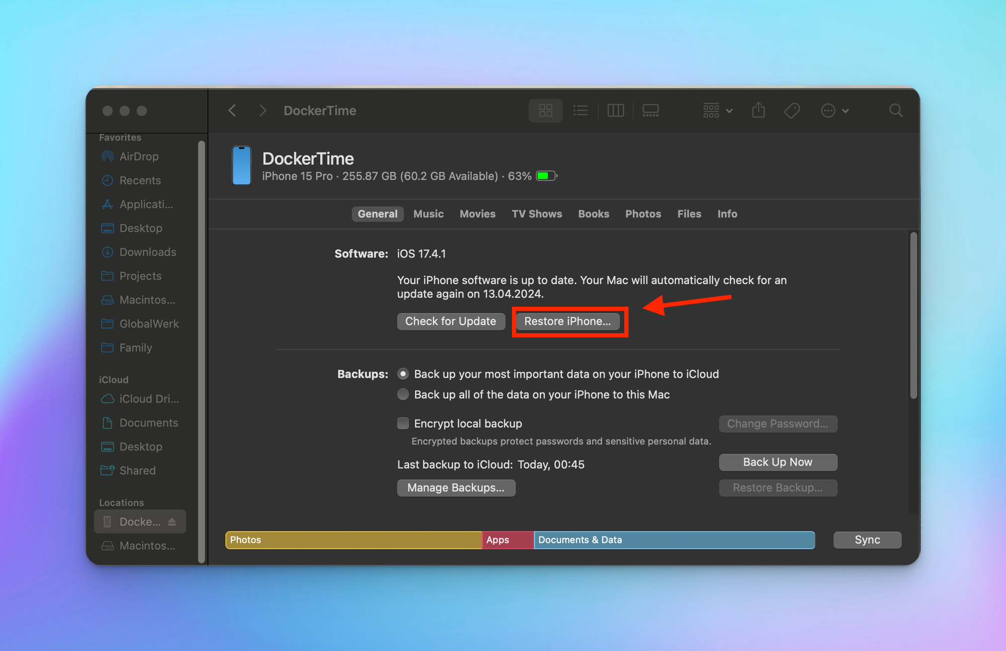 Now, the Finer window displays your iPhone management. Here, click the "Restore iPhone" button. It will take about 20 Minutes to restore and then another 20-30 minutes after the restore to sync your photos, apps, etc., on the freshly installed phone from your latest backup.