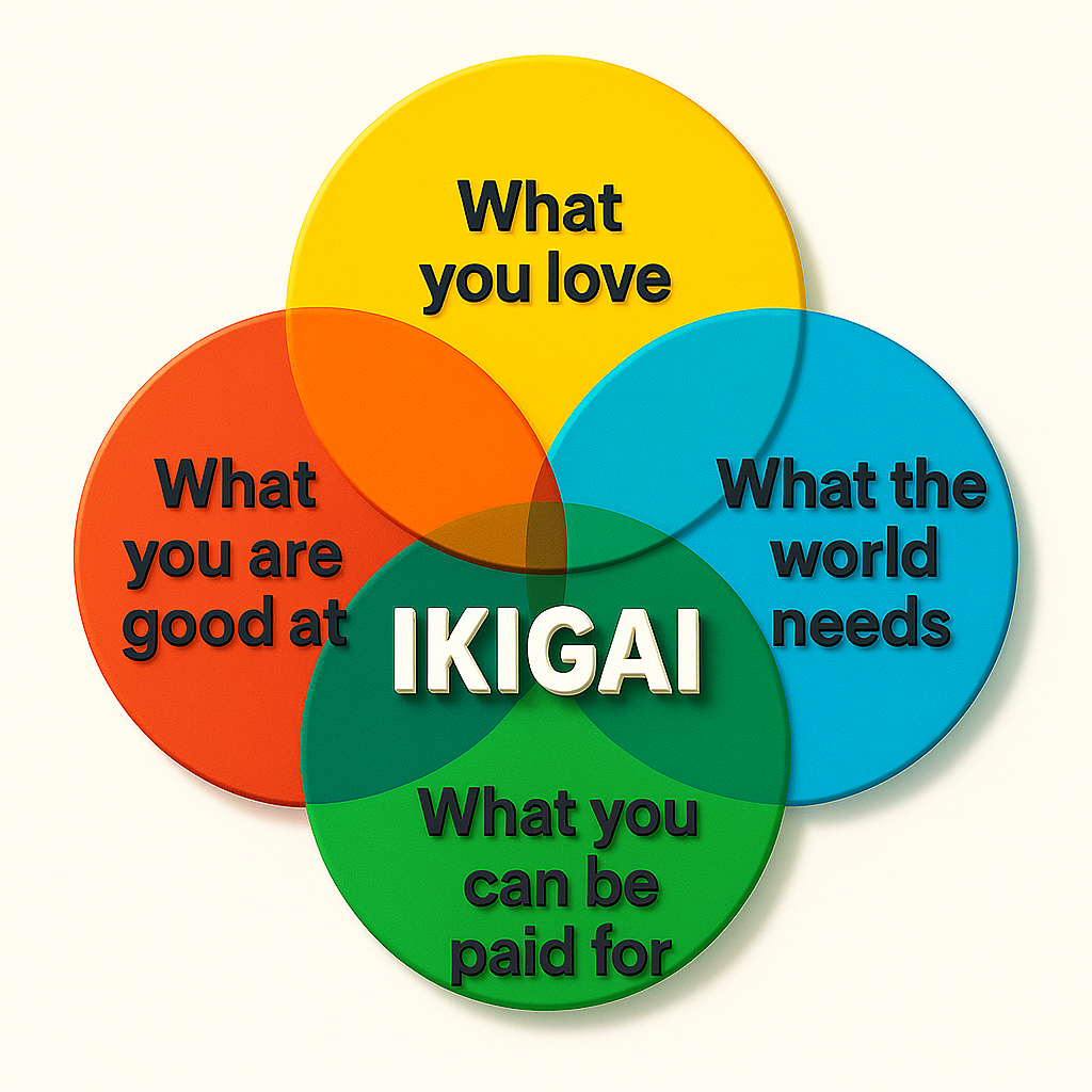 A: Ikigai is a Japanese concept meaning “reason for being.” It’s the sweet spot where four elements intersect: what you love, what you’re good at, what the world needs, and what you can be paid for. When all four align, that’s your personal Ikigai — a compass for living a full, resilient, and meaningful life.