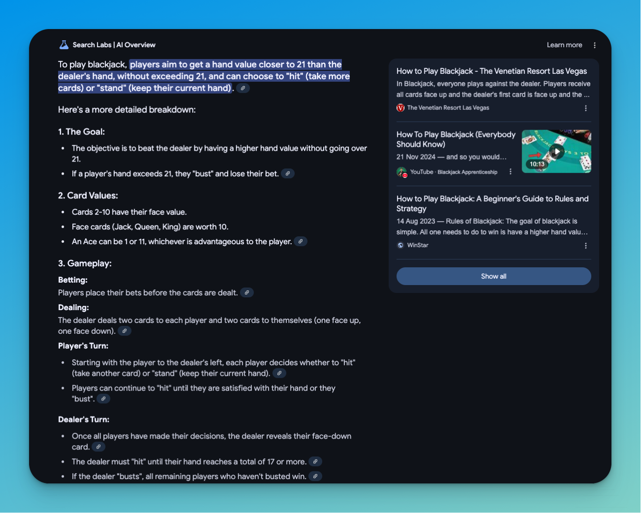 Of course they offer links to actual content but the link is so small in comparison to the content itself. Below I asked Google how to play Blackjack. The answer is clear in the results with little link icons at the end of references. But would someone need to click a link or reference if the answer is already sufficient? Probably not.