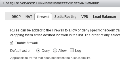 The Firewall is one of the most critical components of the DCS infrastructure in regards to security. It is recommended to use the vShield Edge firewall included inside of DCS or to use a third-party firewall like Fortigate, Checkpoint, Barracuda, or Juniper are just some of the firewalls that are currently in use. Regardless of the firewall selected it is important that a firewall is installed, activated, and configured correctly.