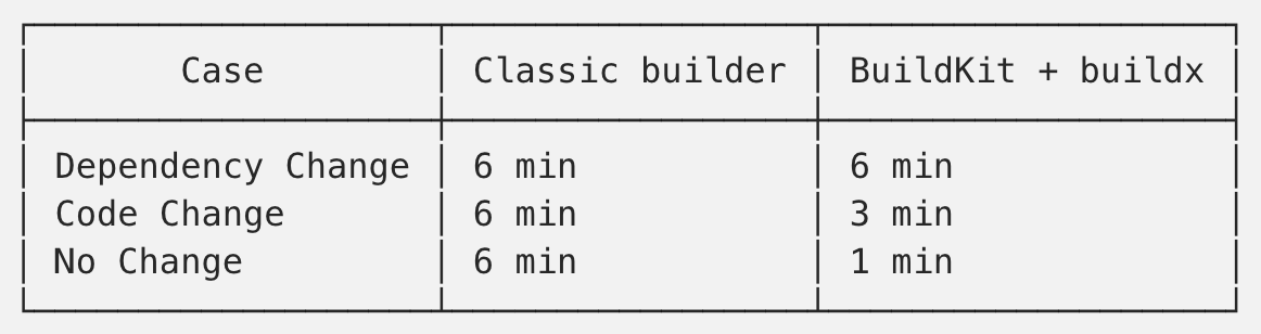 Jiang Huan wrote a great article about how they are using BuildKit combined with builds and leveraging build cache to significantly reduce build times. I am still researching all the possibilities and will report the details of using both BuildKit and build and some more use cases. Stay tuned for more findings.