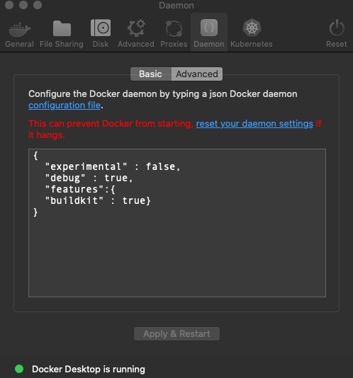 Copy the settings into the Docker Daemon configuration and click Apply & Restart.