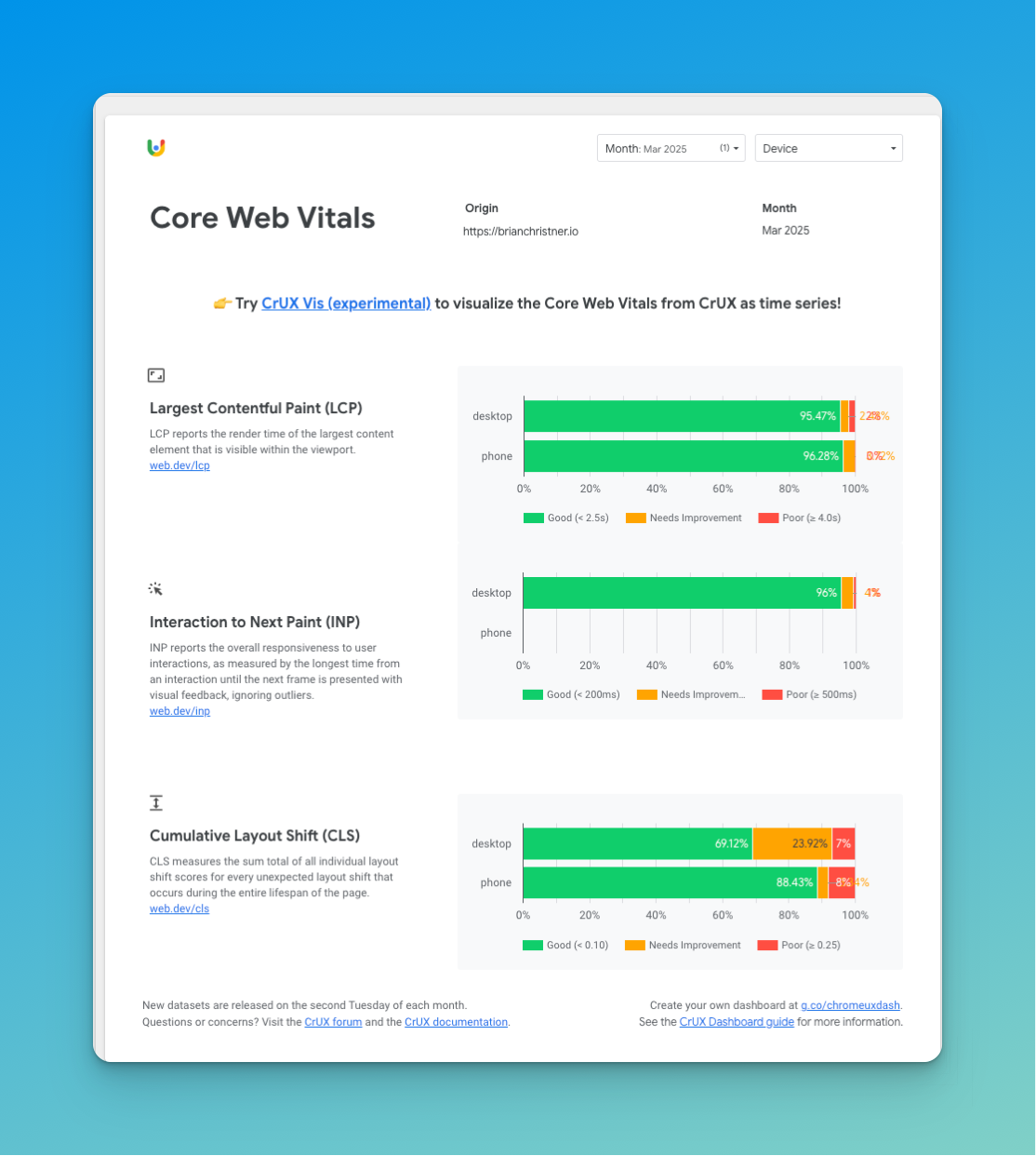 Subscribe to The Weekly Byte →Step 2: Use CrUX.Visualizer for a Fast Snapshot of Performance Trends