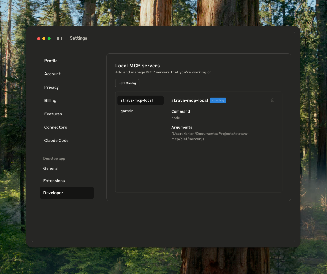 I integrated the Garmin MCP and Strava MCP into Claude Desktop. You will need to follow the instructions for both MCP servers to install them locally on the computer running Claude Desktop.